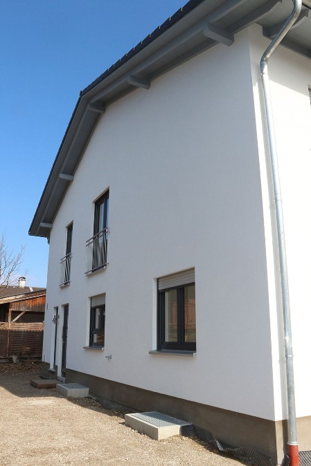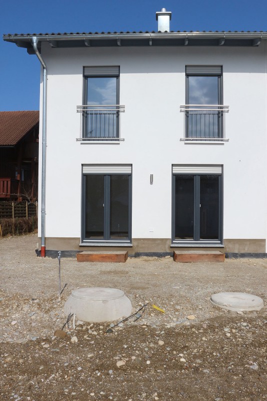 Haushälfte mit Terrassenbereich (in Arbeit), im Vordergrund Zisterne mit 3000L