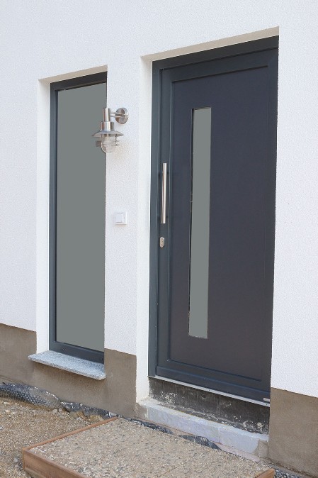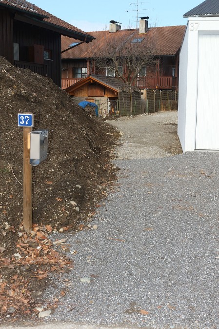 Haushälfte mit Terrassenbereich (in Arbeit), im Vordergrund Zisterne mit 3000L